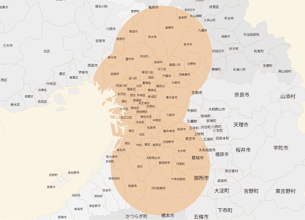 【大阪府】茨木市、枚方市、交野市、四條畷市、寝屋川市、摂津市、吹田市、豊中市、守口市、門真市、大東市、東大阪市、八尾市、松原市、 大阪市(西淀川区、淀川区、東淀川区、此花区、福島区、北区、都島区、旭区、鶴見区、城東区、東成区、中央区、西区、港区、大正区、浪速区、天王寺区、生野区、平野区、東住吉区、阿倍野区、住吉区、西成区、住之江区)、藤井寺市、羽曳野市、堺市(堺区、北区、中区、西区、東区、南区、美原区)、大阪狭山市、富田林市、太子町、河南町、千早赤坂村